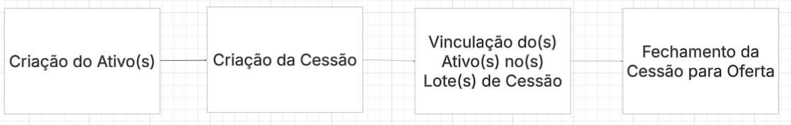 A sistemática geral, para criação de ativos, tem a lógica de criação do ativo de forma isolada e/ou assíncrona. Após isso, no momento de criação do(s) Lote(s) de cessão, vincula-se os ativos criados na carteira do cedente, ao que está sendo ofertado.
